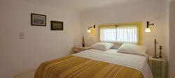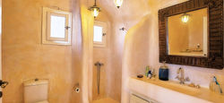 A moradia é construída em estilo tradicional (combinando as pedras com o estilo das Cíclades caiadas de branco) à direita da rocha (que pode ser visto também em alguns dos quartos, como os banheiros),