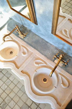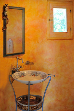 On the lower floor there are 3 comfortable bedrooms with their own bathrooms, all traditionally built and painted in ochre or sky blue color. Every bedroom contains heat and air conditioning system.